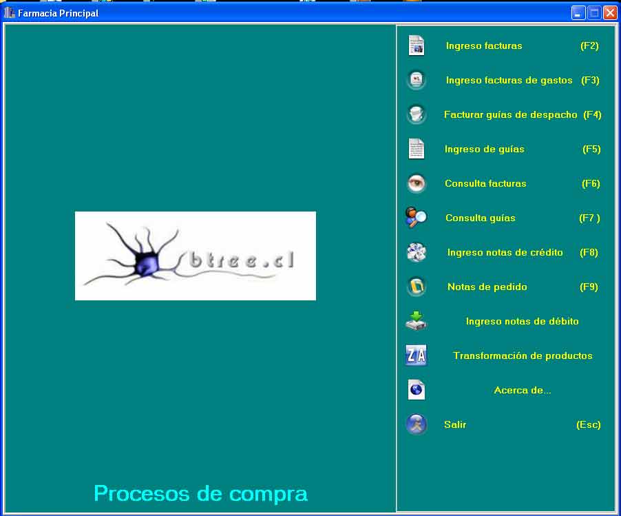 En esta figura se muestra el menú principal del módulo de Ingreso de Compras del Sistema de Gestión de btree.cl En este módulo el usuario puede, - ingresar facturas, - ingresar guías de despacho, - ingresar notas de crédito, - ingresar pedidos a proveedores y luego facturarlos, - transformar productos, entre otros aspectos.