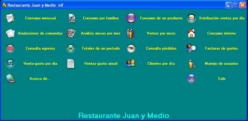 En esta figura se muestra el menú principal del módulo Estadísticas. En este módulo el usuario puede, - consultar la venta por período, - consultar la venta por mozo, - consultar la venta por mesa, - obtener las ventas por dia comparadas con gastos, - consultar por pérdidads, entre otros aspectos.